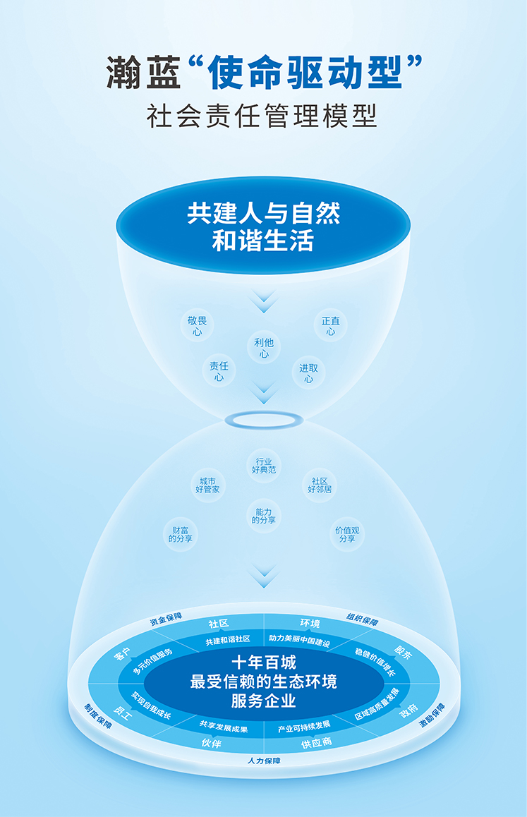 以使命为驱动,系统谋划、精准施策、持续发力,推动社会责任工作融入公司战略、业务运营、企业文化,提升综合能力,打造行业领先、国内一流的瀚蓝社会责任实践行动范式,持续丰富“三好三分享,五心瀚蓝人”的责任内涵,助力“十年百城,最受信赖的生态环境服务企业”战略目标顺利实现。