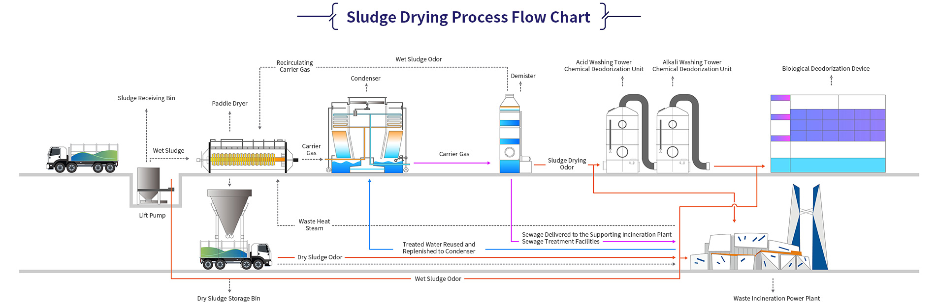 - Directly pump the odor into the domestic waste incinerator for combustion and removal through the advanced negative pressure system, along with advanced ancillary biological deodorization technology, to completely solve the odor problem in sludge treatment.
